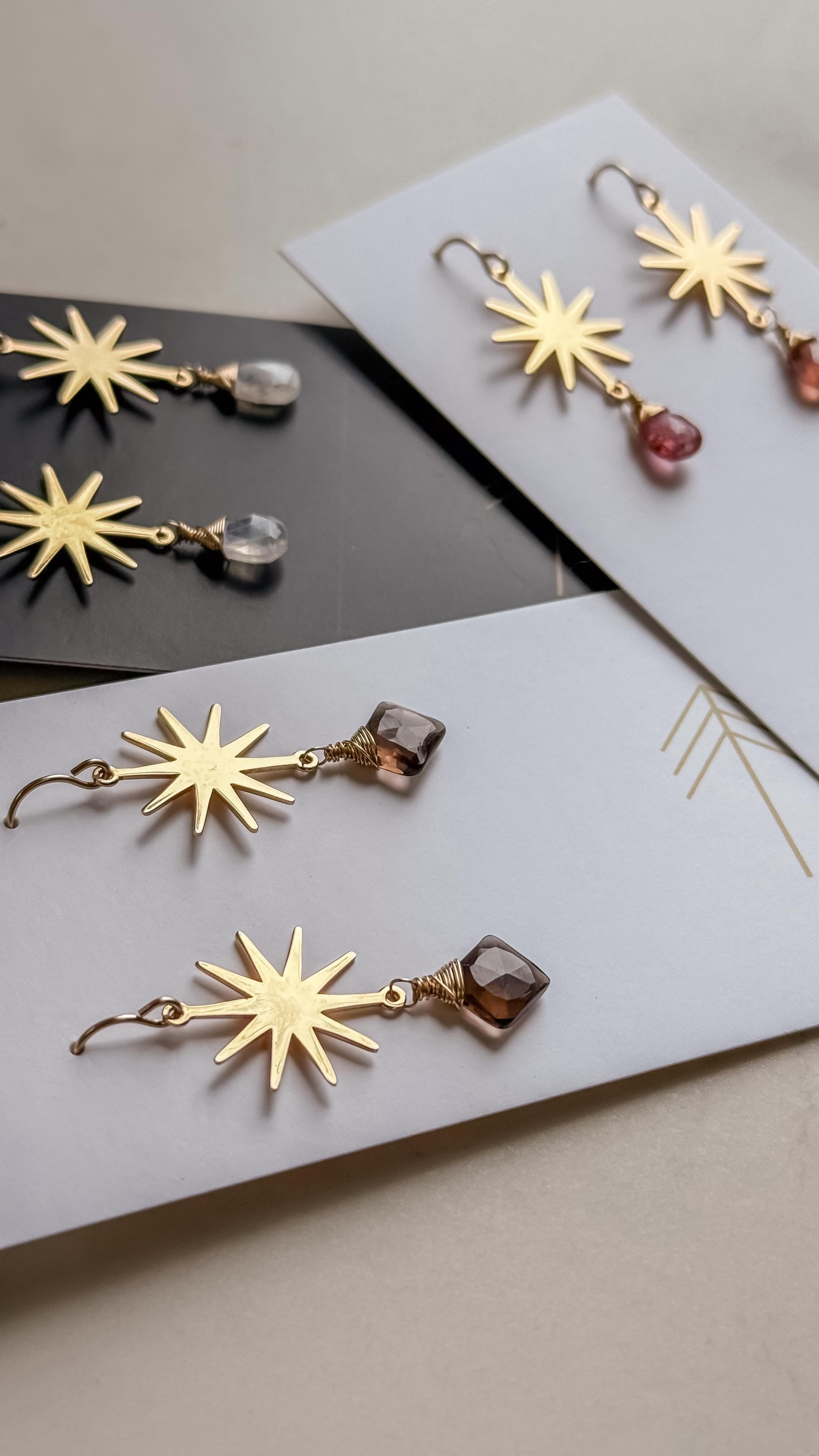 These brass earrings have a thin-profile and light feel. They feature a crescent moon shining into concentric diamond shapes, accented with a gemstone drop.