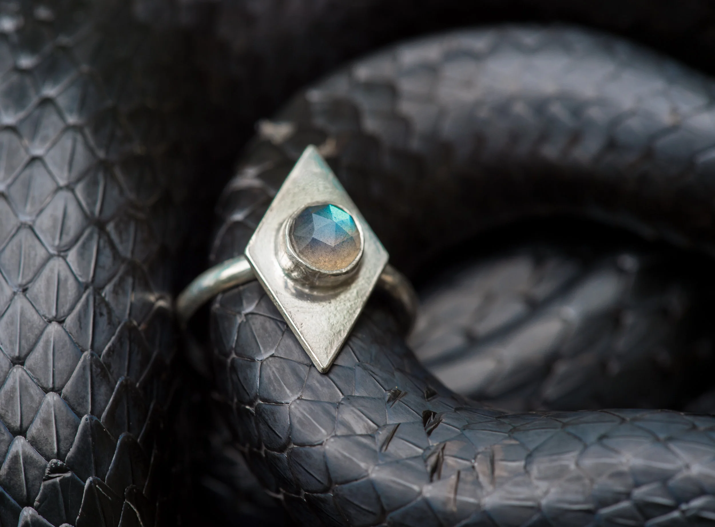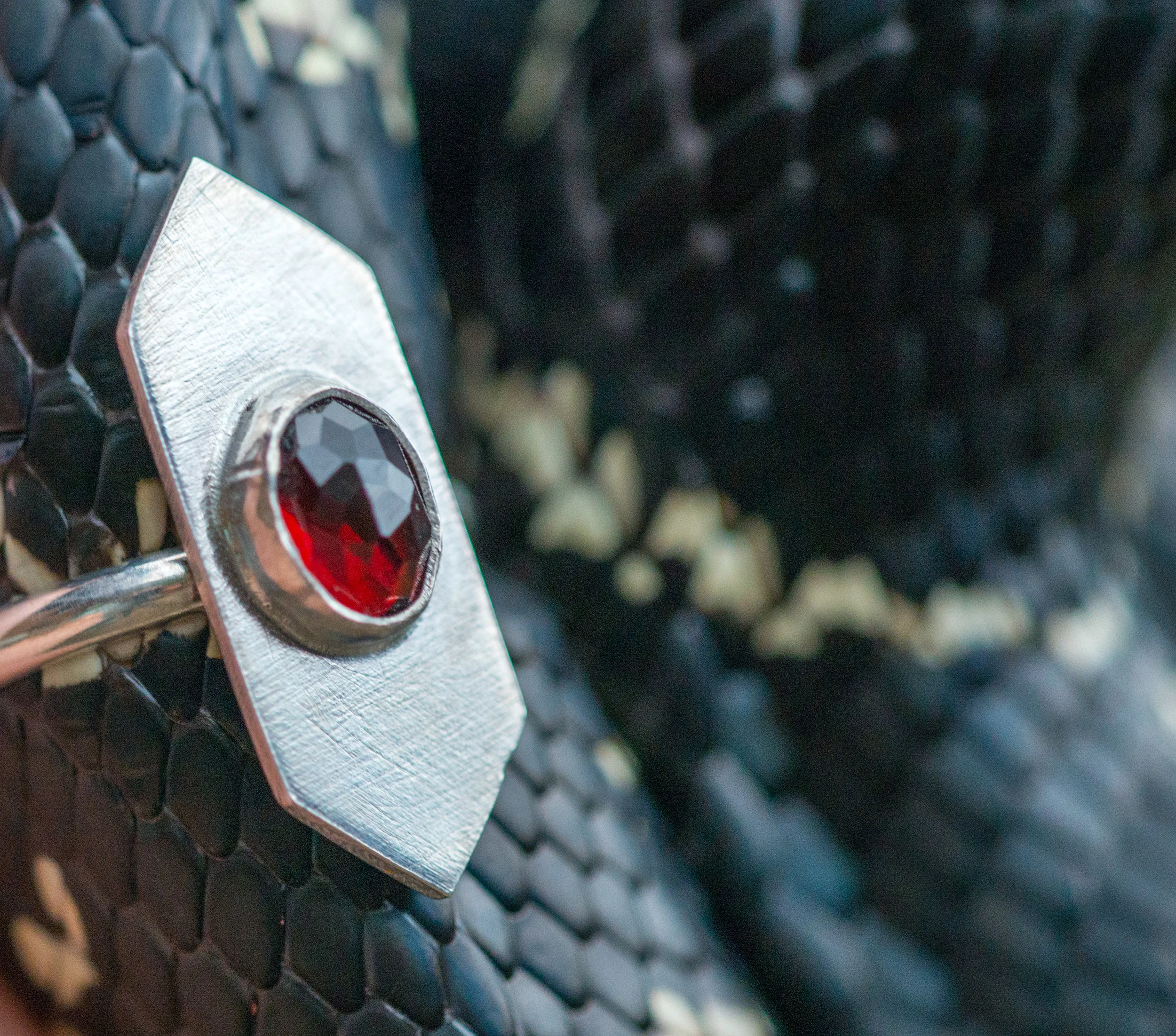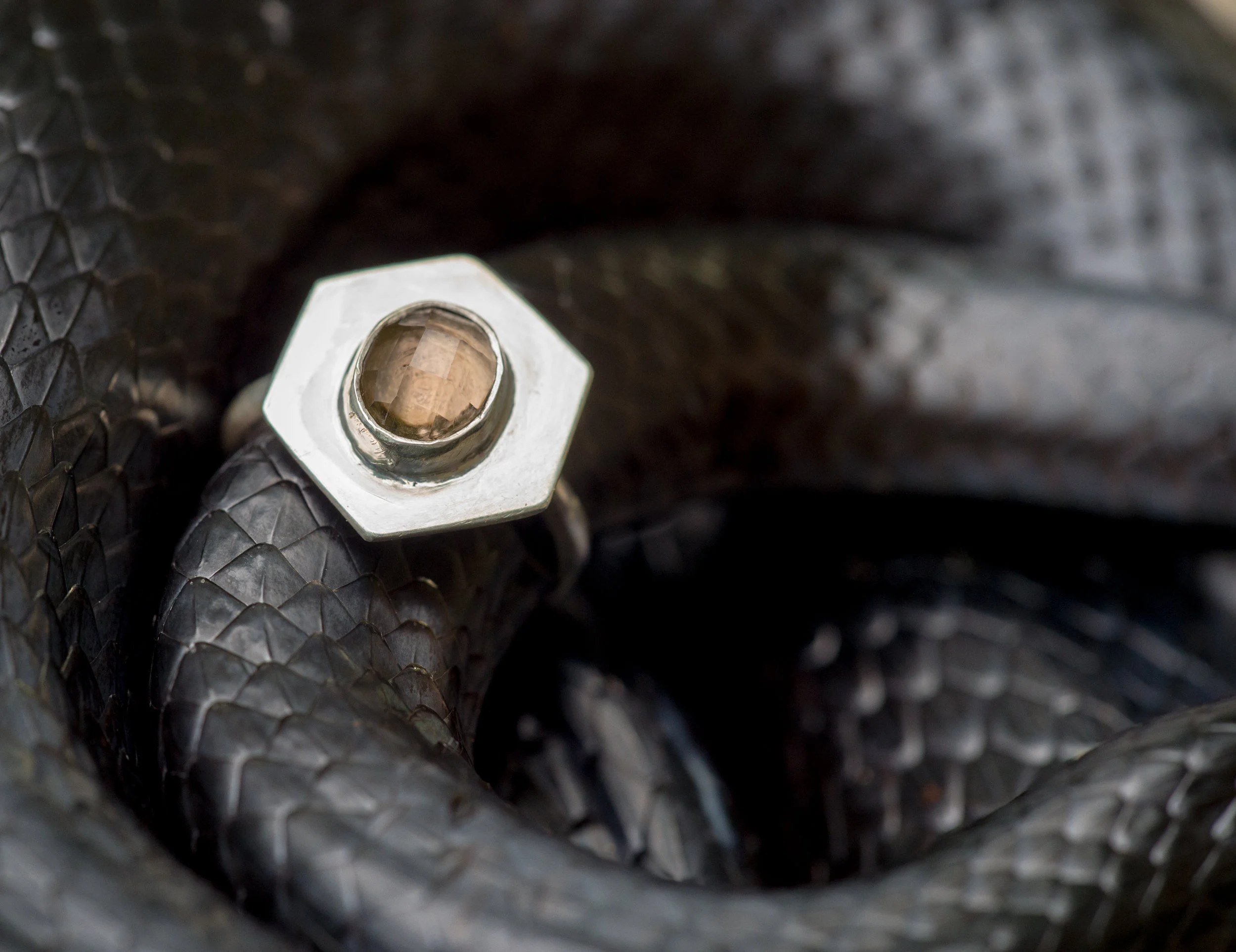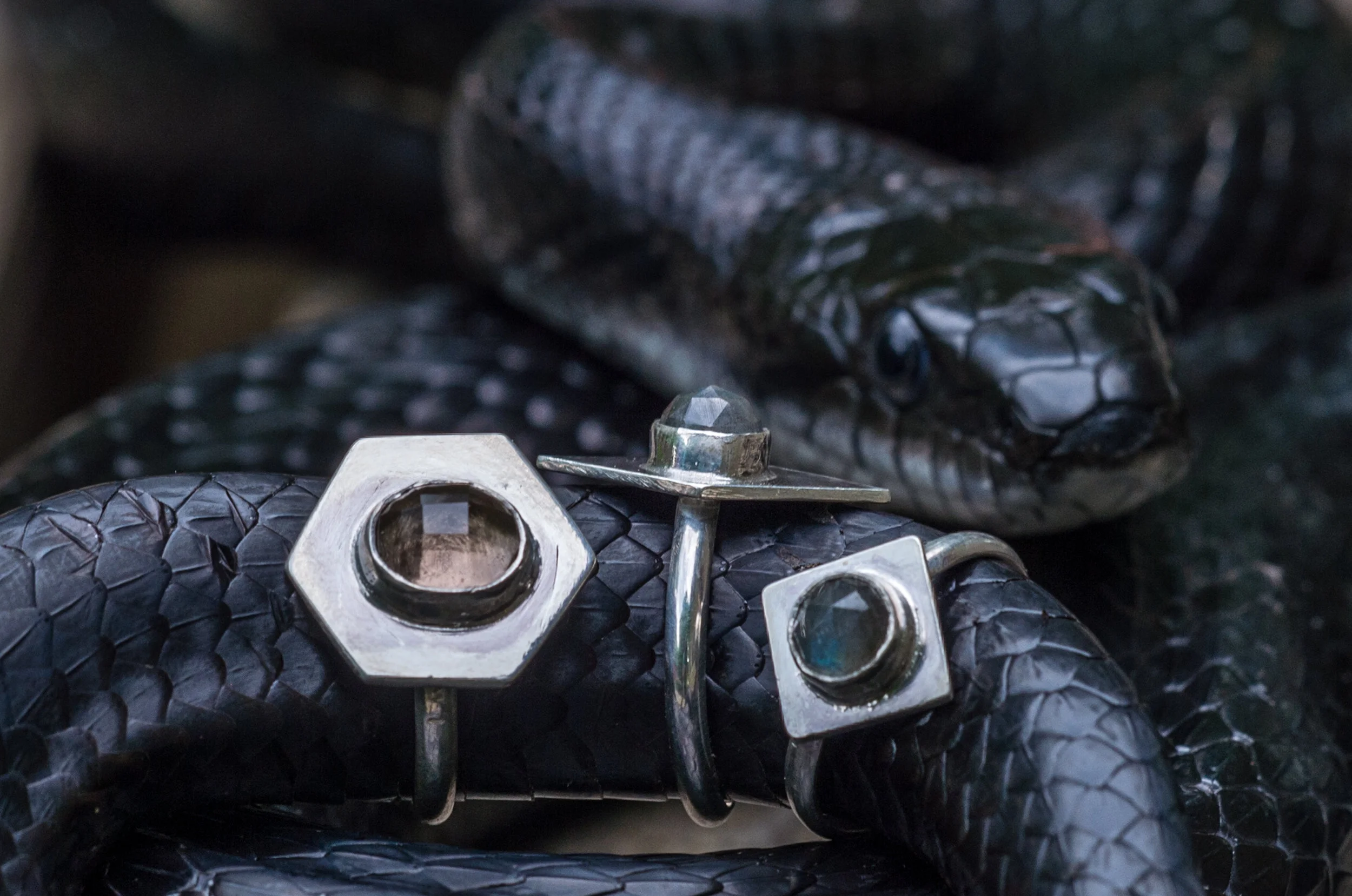 About a month or so ago, a friend and I tossed around the idea to photograph the beginning pieces of The Geometric Collection with a snake! Just think about it... the snake would be the perfect "model"... it has the symmetrical patterns and geometric shapes on it's skin! Not to mention, snakes symbolize new beginnings, which is just what this new collection is for me! Take a peek at some photos from the photoshoots! (And don't worry! The snakes were not harmed and were released where they were found.)