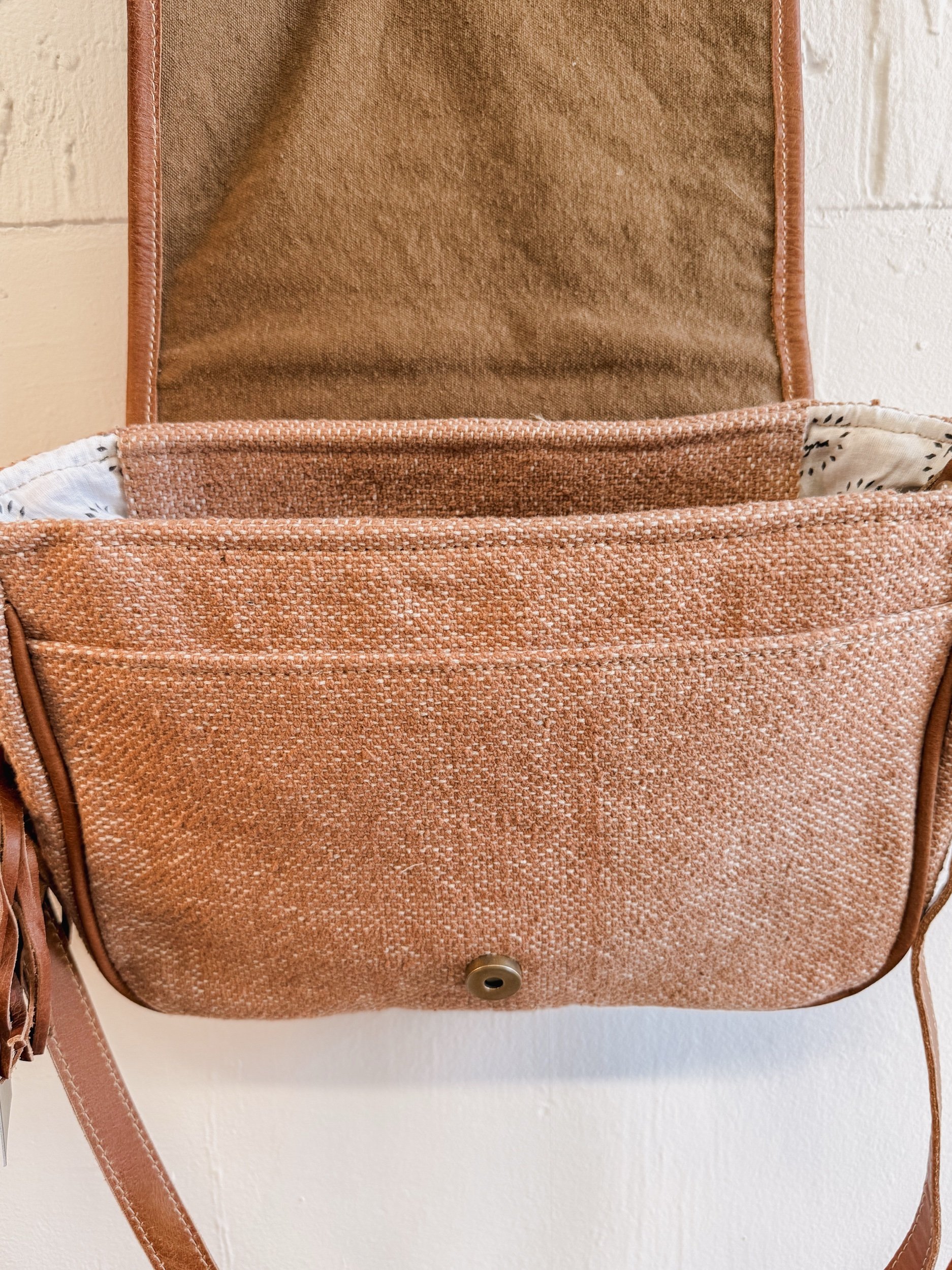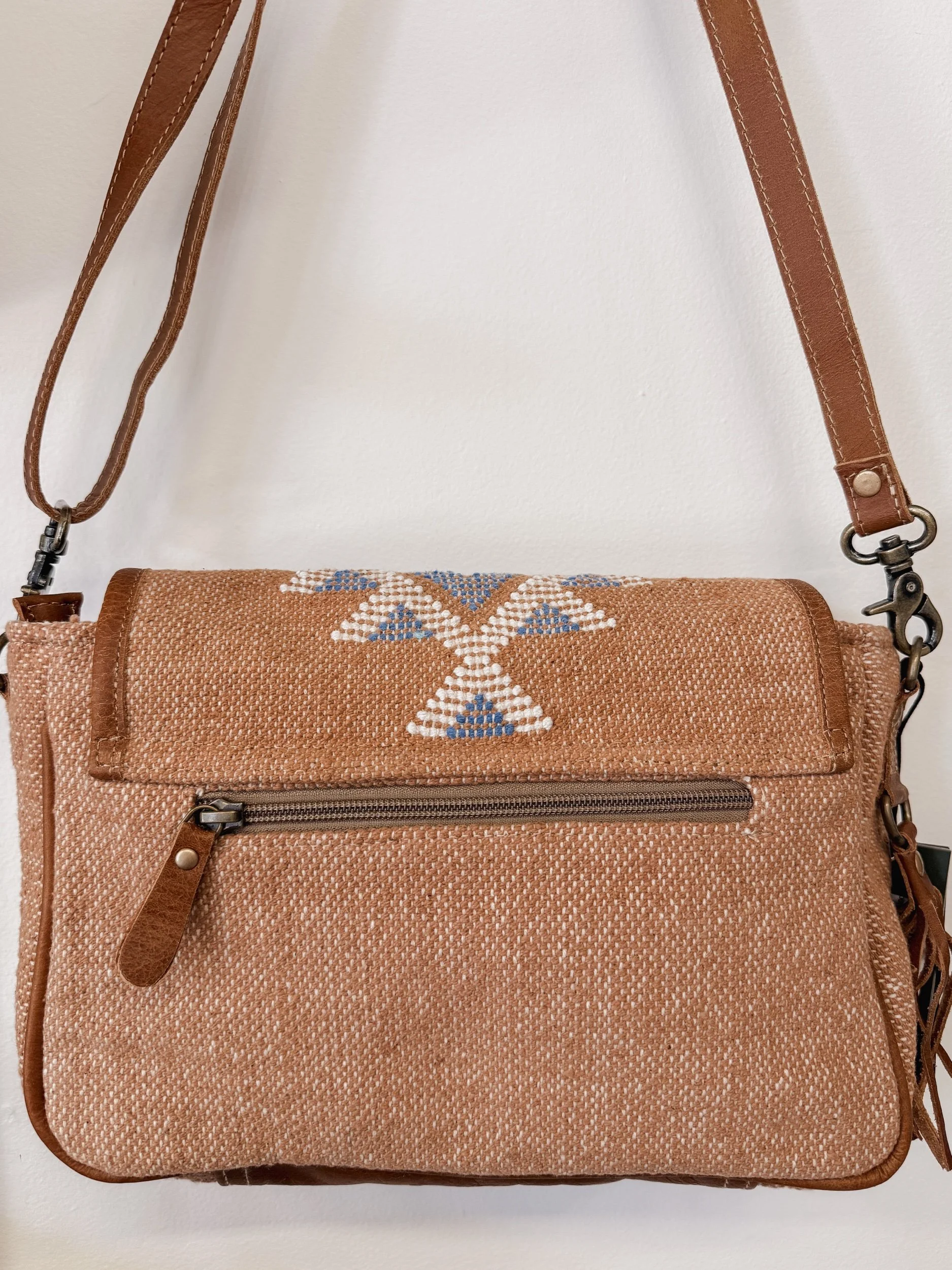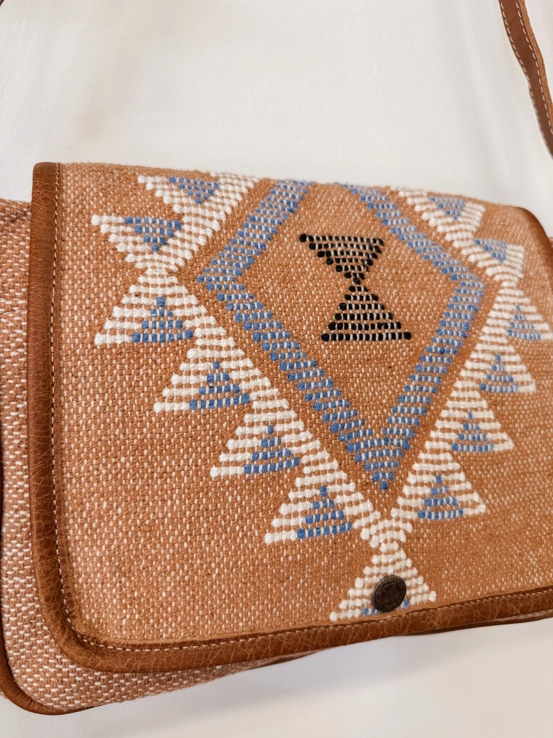 Made from an upcycled rug, this one-of-a-kind piece features a soft tan base with blue and white Southwestern-inspired patterns. Finished with an adjustable, detachable leather strap and tassel for an easy boho feel. Flap front with a zippered top closure.